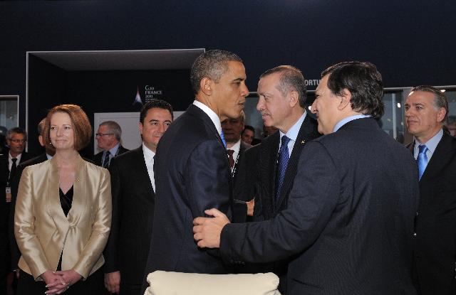 Embrace between Barack Obama, President of the United States, in the centre, and José Manuel Barroso, from behind, in the presence of Recep Tayyip Erdoğan, Turkish Prime Minister, 3rd from the right who is obviously looking the other way, and Julia Gillard, Australian Prime Minister, on the left, on the occasion of the G20 Summit in Cannes.