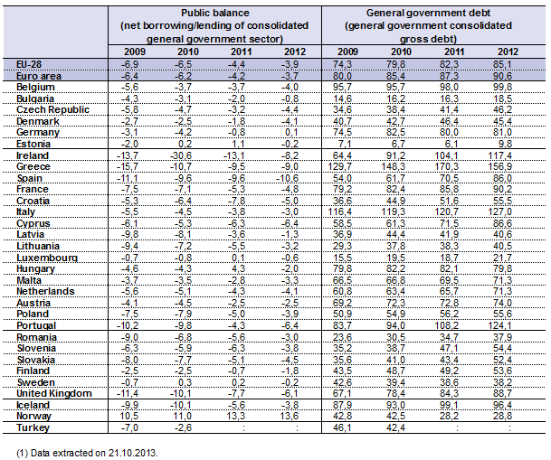 According to EU legislation, member states are obliged to keep their government deficits bellow the benchmark of 3% of GDP. Only a few manage to attain that. If deficits are large, the ‘excessive deficit procedure’ is triggered, obliging the country to apply austerity measures, as in the case of the abovementioned member states. Eurostat found that “In the EU-28 the government deficit-to-GDP ratio decreased from -4.4 % in 2011 to -3.9 % in 2012 and in the euro area it decreased from -4.2 % to -3.7 %. Germany registered a government surplus in 2012. There were eight Member States, which recorded deficits in 2012 that were lower than the -3% threshold. Deficit ratios were greater than or equal to the reference threshold of -3 % of GDP in 19 of the Member States in 2012: the largest government deficits (as a percentage of GDP) in 2012 were recorded by Spain (-10.6 %), Greece (-9.0 %), Ireland (-8.2 %), Portugal and Cyprus (both -6.4 %), and the United Kingdom (-6.1 %)”.