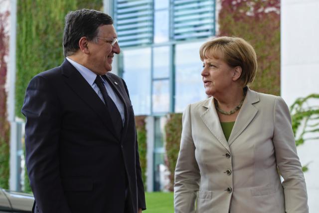 Discussion between Angela Merkel, on the right, and José Manuel Barroso during the Western Balkans Summit (EC Audiovisual Services, 28/08/2014)