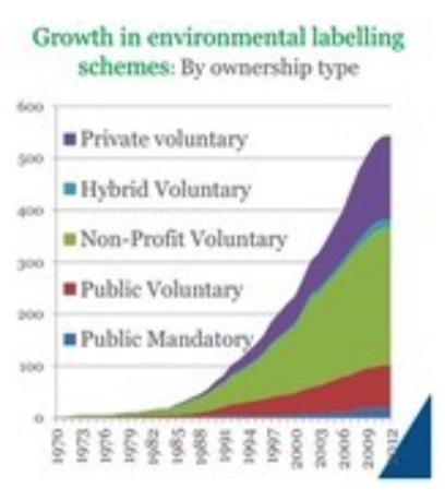 Growth in the numbers of voluntary schemes is primarily (31 per cent) due to an increase in ELIS set up by non-profit organisations on food and agricultural products. A further 18 % of increase in numbers is due to new, private ELIS which cover quantitative, life-cycle based reporting of energy and carbon. Green branding is now an integral part of marketing. However, big business adopting standards can run into trade disputes as well.