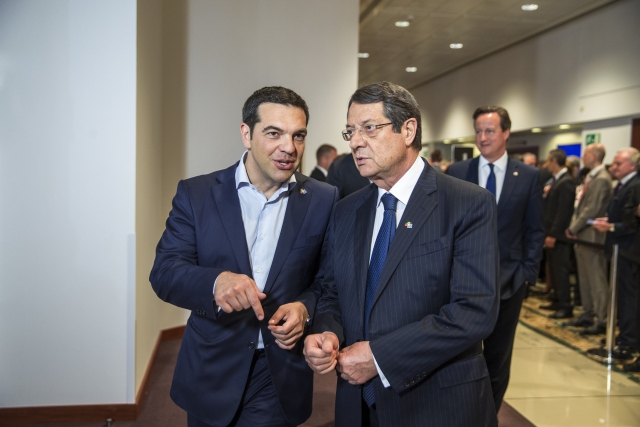 “It will be this coming weekend that we impose capital controls in Greece, like you did in 2013”, Tsipras would might as well be saying to the President of Cyprus. From left to right: Mr Alexis TSIPRAS, Greek Prime Minister; Mr Nicos ANASTASIADES, President of Cyprus (Council TVNewsroom, 10/06/2015).