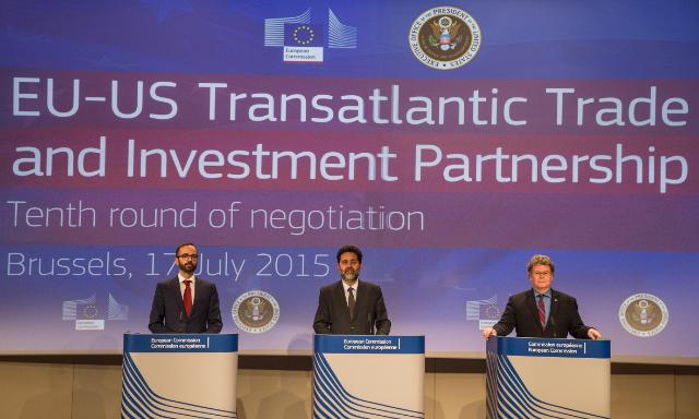 Daniel Rosario, EC’s Spokesperson for Agriculture and Rural Development; and Trade, Ignacio Garcia Bercero and Dan Mullaney (from left to right) at Tenth round of EU/United States negotiations on Trade and Investment, Brussels, 13-17/07/2015 (EC Audiovisual Services, 13/07/2015).